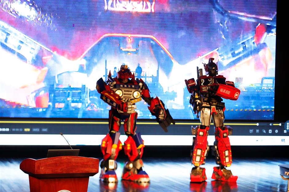 yangpu district firefighters dress up as transformers to give students a lesson on public safety.